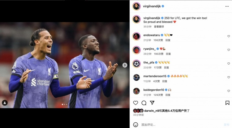 2月18日讯 利物浦4-1击败布伦特福德,此役范迪克迎来红军生涯250场里程碑,球员赛后发文。