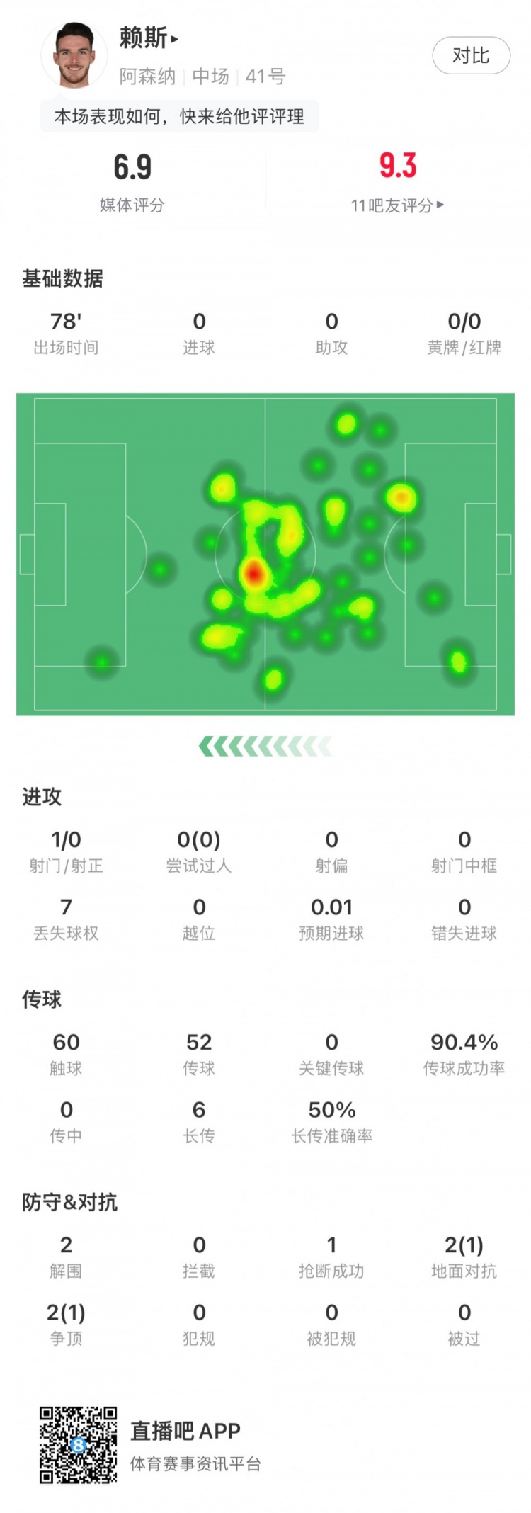 赖斯战伯恩利数据:评分6.9,传球成功率90.4%&2次解围