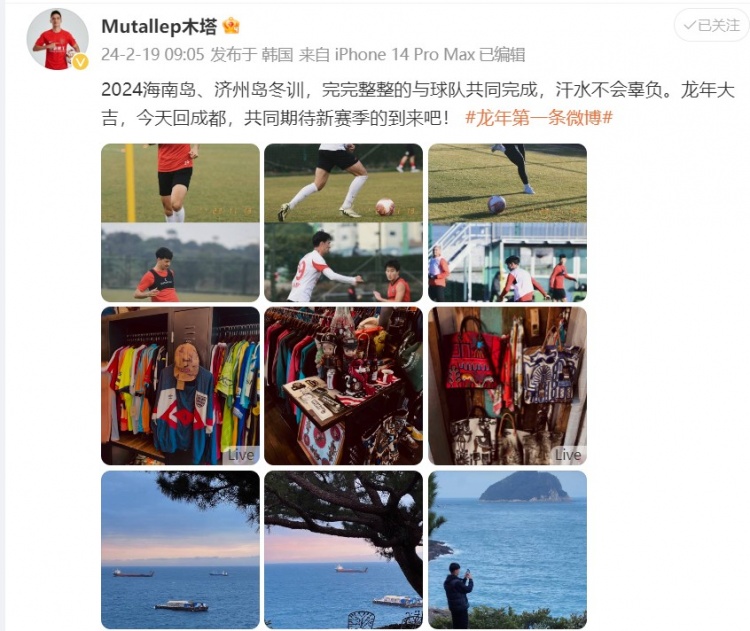木塔力甫在个人微博中晒出多张图片,并写道:2024海南岛、济州岛冬训,完完整整的与球队共同完成,汗水不会辜负。龙年大吉,今天回成都,共同期待新赛季的到来吧!