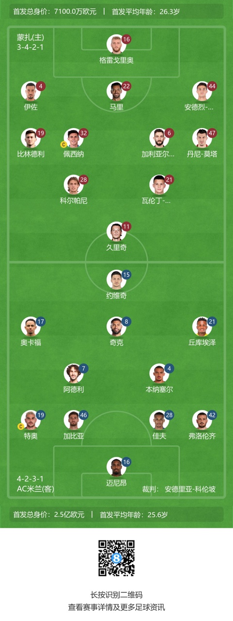 蒙扎首发:16-格雷戈里奥、44-安德烈-卡博尼、22-马里、4-伊佐、47-丹尼-莫塔、6-加利亚尔迪尼、32-佩西纳、19-比林德利、21-瓦伦丁-卡博尼、28-科尔帕尼、11-久里奇