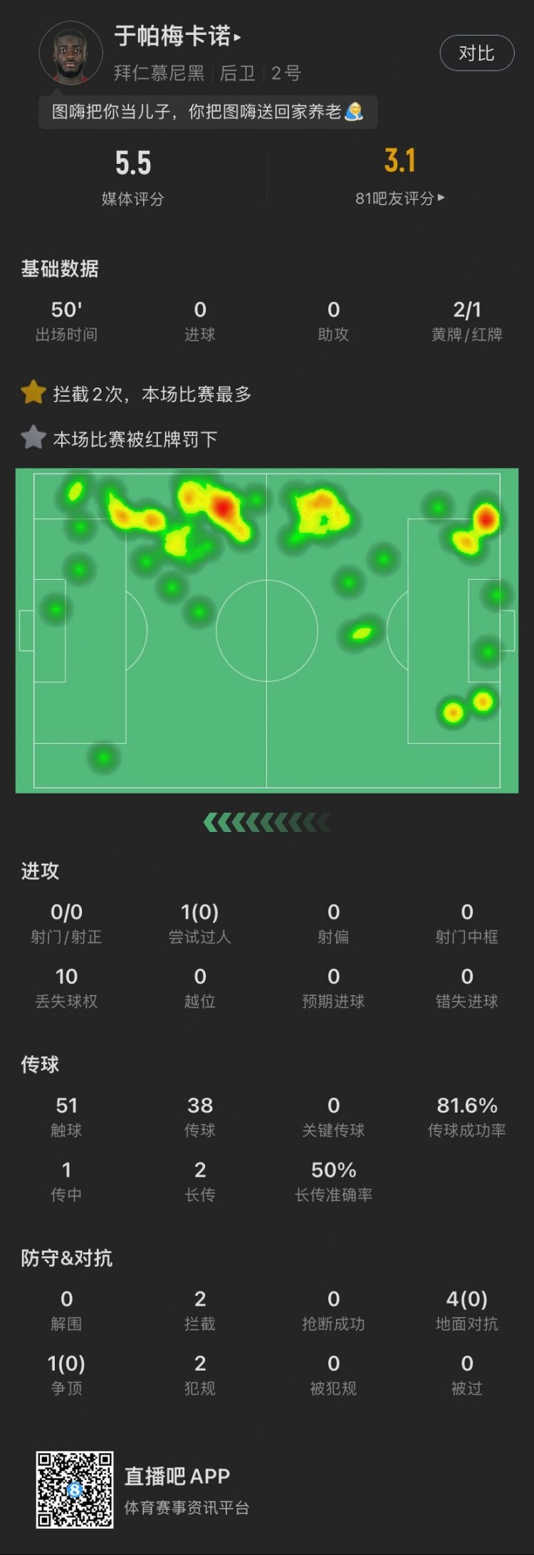 战犯表现!于帕数据:替补登场染红,5次对抗0成功,评分全场最低