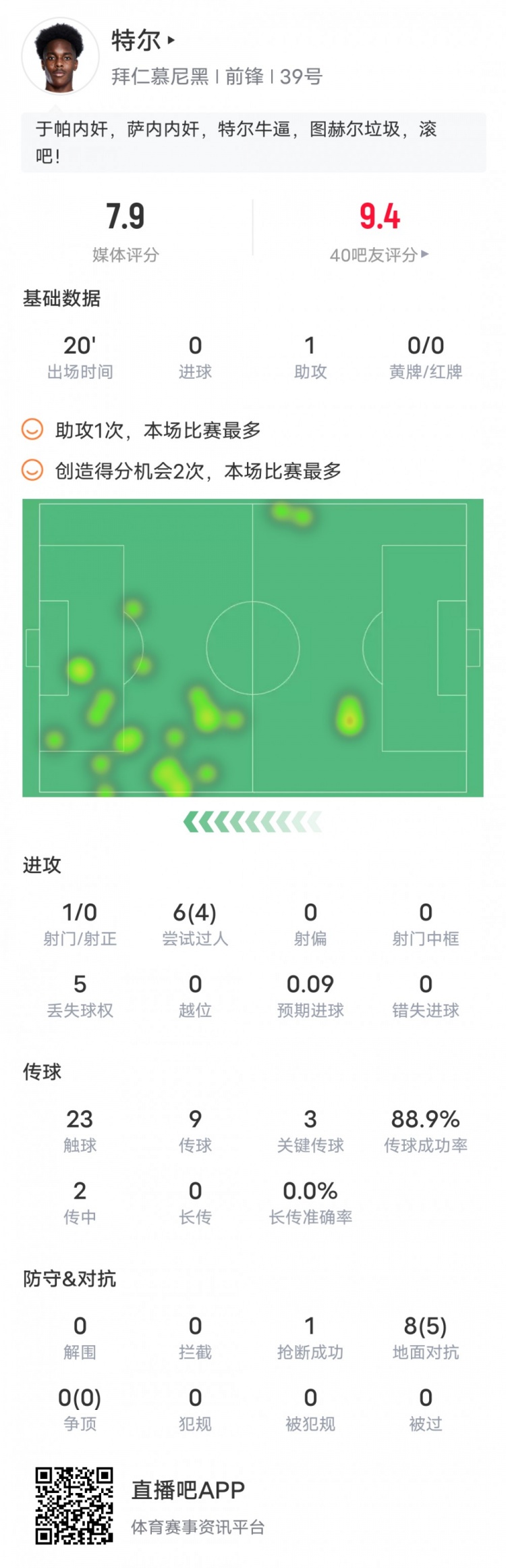 2月19日讯 在拜仁2-3不敌波鸿的比赛中,特尔替补出战,贡献1次助攻,送出3次关键传球,还有4次过人成功,评分7.9。