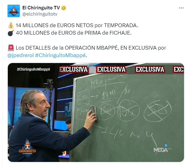 六台今日独家爆料,姆巴佩加盟皇马后,税后年薪为1400万欧,签字费4000万欧。