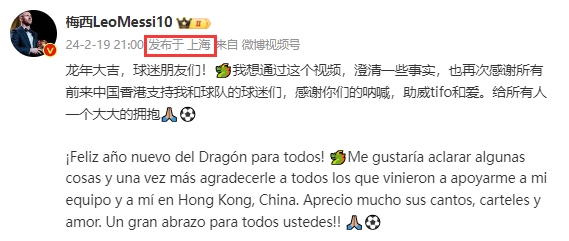 梅西微博昨日发布了梅西对中国香港行未登场的解释视频。根据IP,这条微博发布于上海。梅西微博在2月7日也曾发文对未能登场进行解释,当时的IP显示为四川。