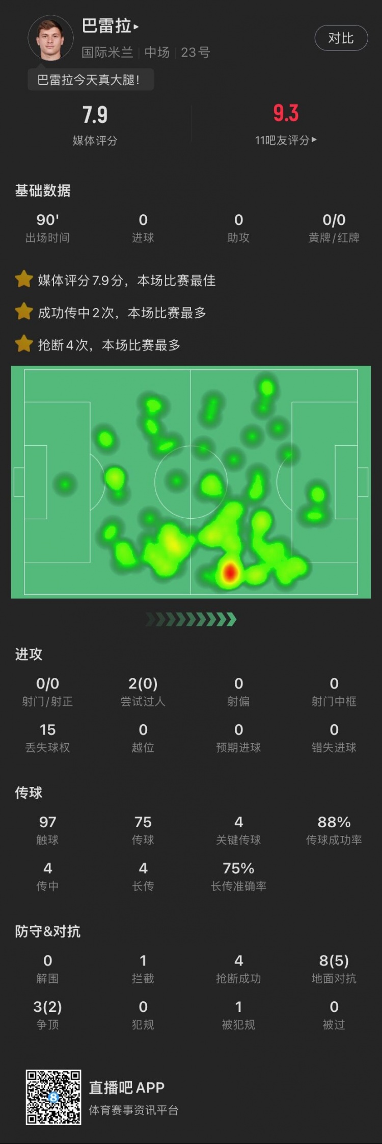 巴雷拉本场数据:4脚关键传球,贡献1拦截4抢断,评分7.9全场最高