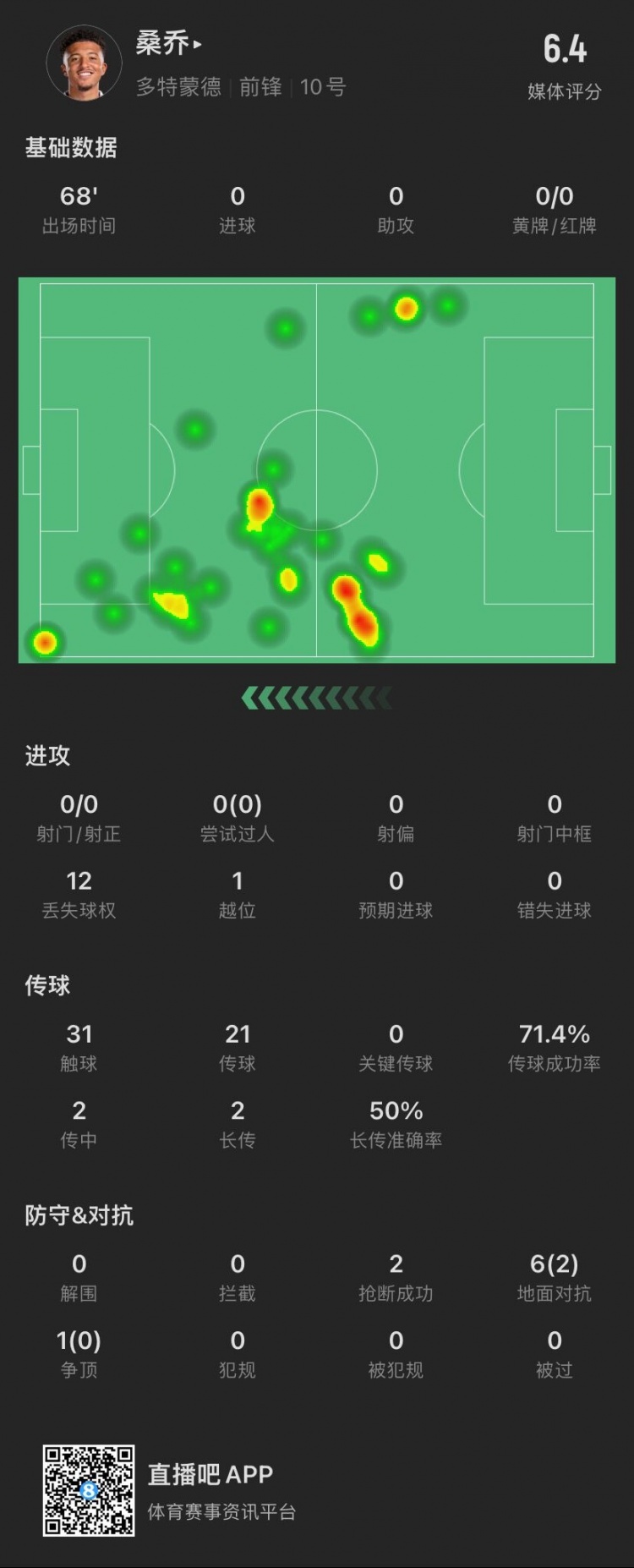 桑乔本场数据:0射门0过人,7次对抗成功2次,评分6.4暂全场最低
