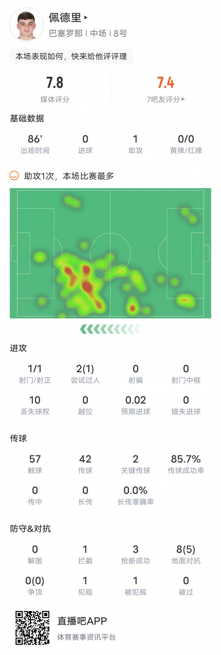 佩德里本场比赛数据如下: