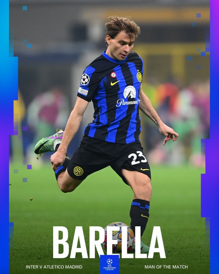 大腿!国米官方:巴雷拉当选1-0马竞队内全场最佳球员