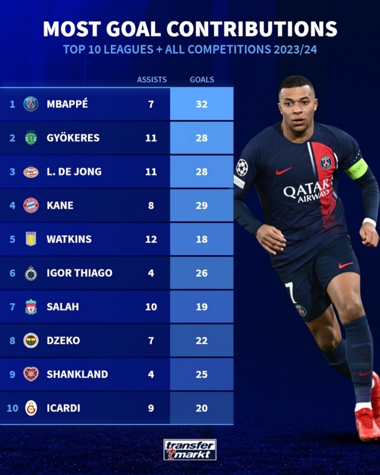 2月23日讯 德国转会市场统计了欧洲前十联赛球员本赛季的参与进球数量,并列出榜单,姆巴佩、吉奥克雷斯、卢克-德容并列首位。
