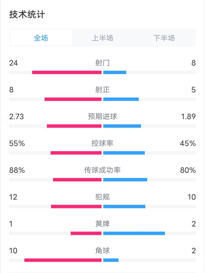 雷恩VSAC米兰全场数据:射门24-9,射正8-5,角球10-2