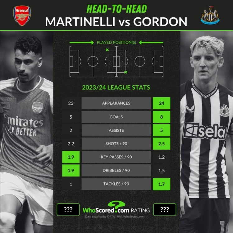 2月24日讯 北京时间明天凌晨,阿森纳将在英超第26轮比赛中主场对阵纽卡。WhoScored统计了两队前锋马丁内利、戈登本赛季的英超数据,并作出对比。马丁内利、戈