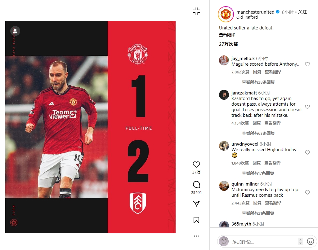 英超第26轮,曼联1-2遭富勒姆绝杀,本场比赛曼联前锋拉什福德发挥不佳,赛后在曼联官方和他自己的社媒评论区,球迷们对他展开了激烈批评。在拉什福德个人的社媒下