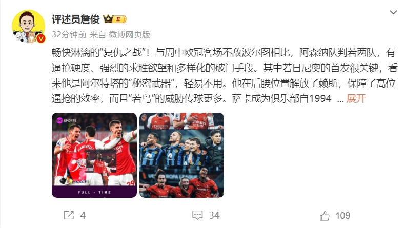 02月25日讯 阿森纳本轮4-1击败纽卡,赛后詹俊发文点评。
