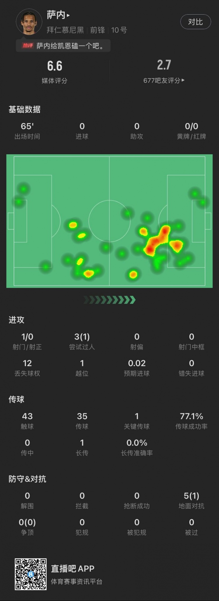 萨内本场:1射0正,5次对抗成功1次,3次过人成功1次,获评6.6分