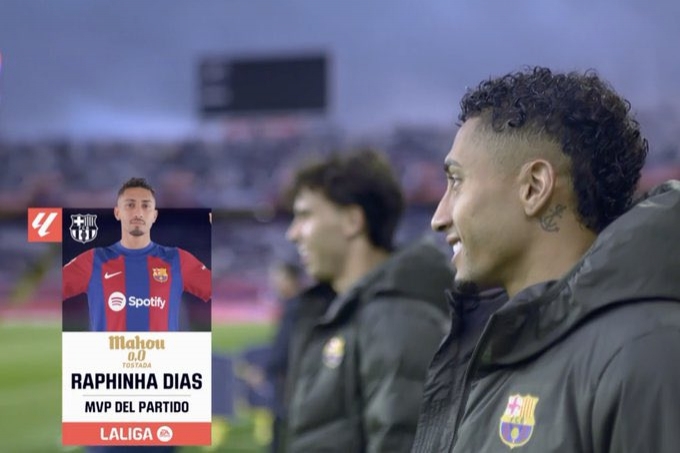 传射建功!官方:拉菲尼亚当选巴萨4-0赫塔费全场最佳球员