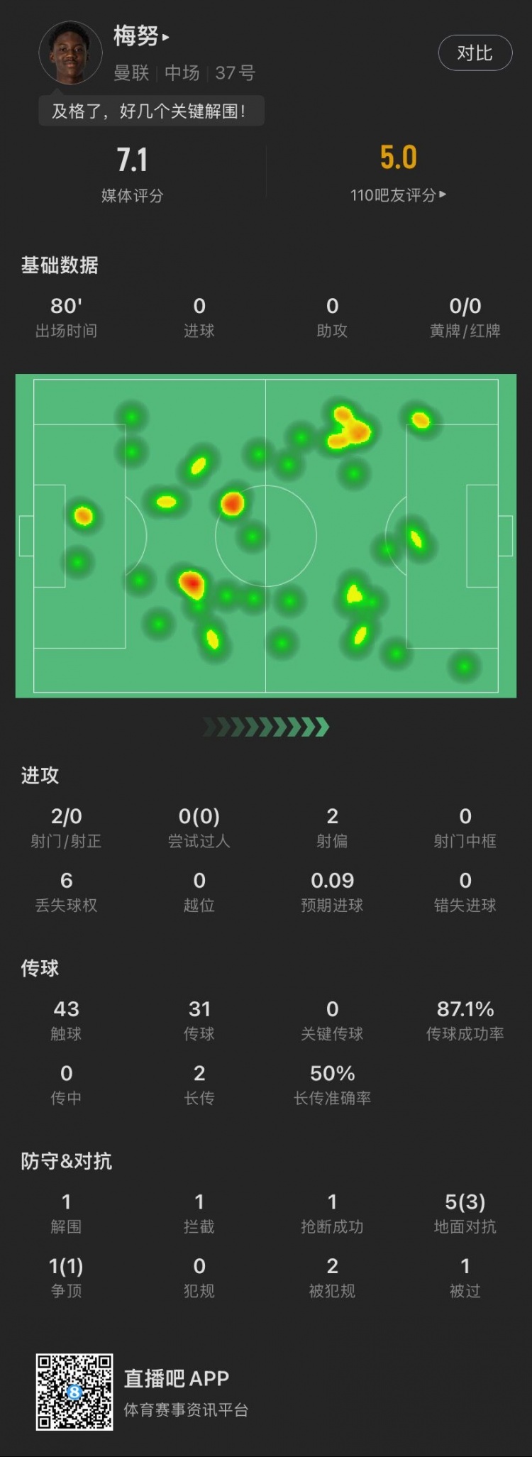 18岁梅努本场数据:2次射门0射正,贡献1解围1拦截1抢断,评分7.1