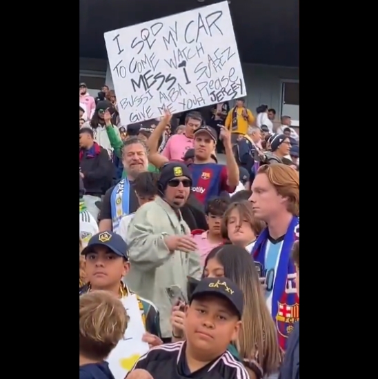 一球迷举标语:我卖了车来看梅西苏牙布斯克茨,请给我你们的球衣