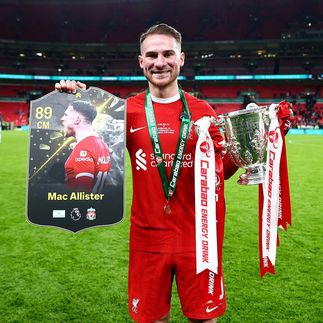 赢下大对决!利物浦绝杀夺联赛杯,麦卡手持升级卡片与奖杯合影