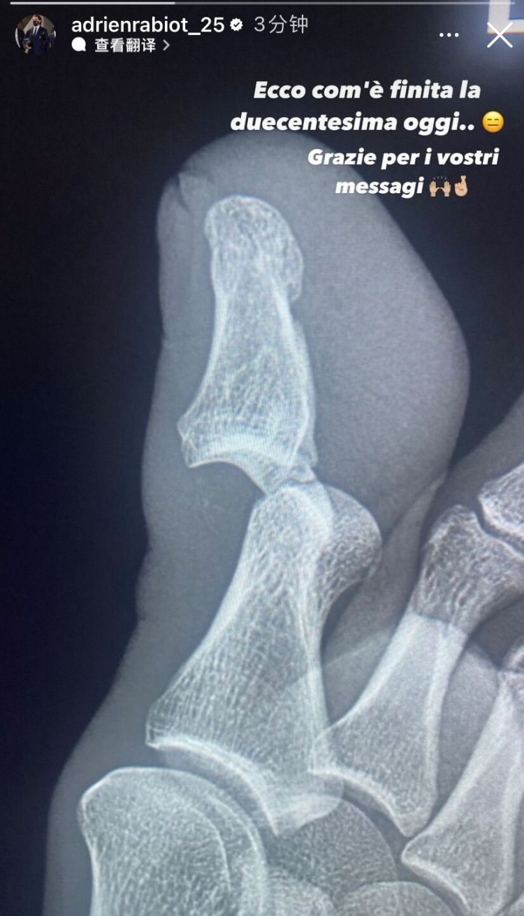 赛后,拉比奥特也发出了自己脚趾的X光图片,可以看出脚趾的确严重脱臼。拉比奥特写道:200场里程碑就这样结束了,感谢大家的暖心留言。