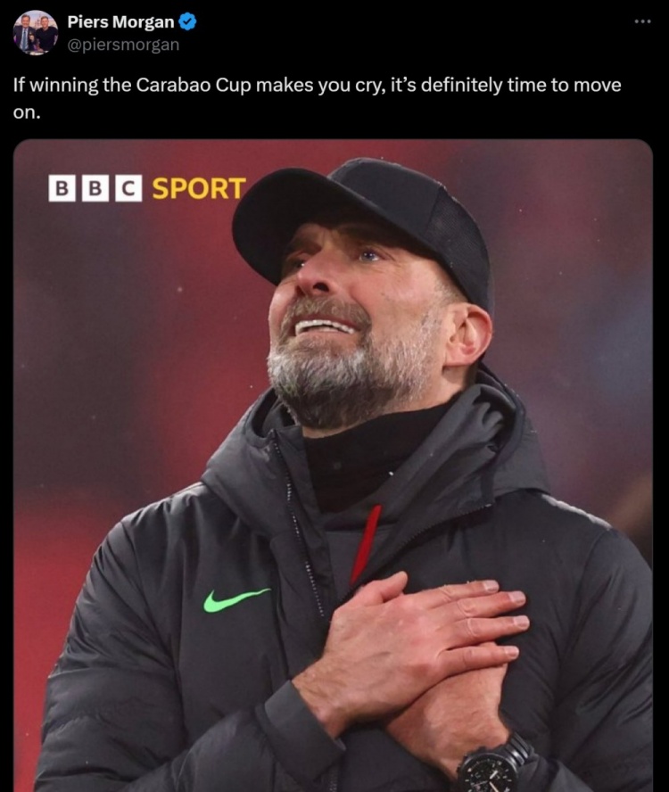 不过,知名枪迷、英国名嘴皮尔斯-摩根晒出克洛普眼泛泪光的照片,并配文:如果赢个卡拉宝杯你也能哭,那绝对到了应该做出改变的时间了。