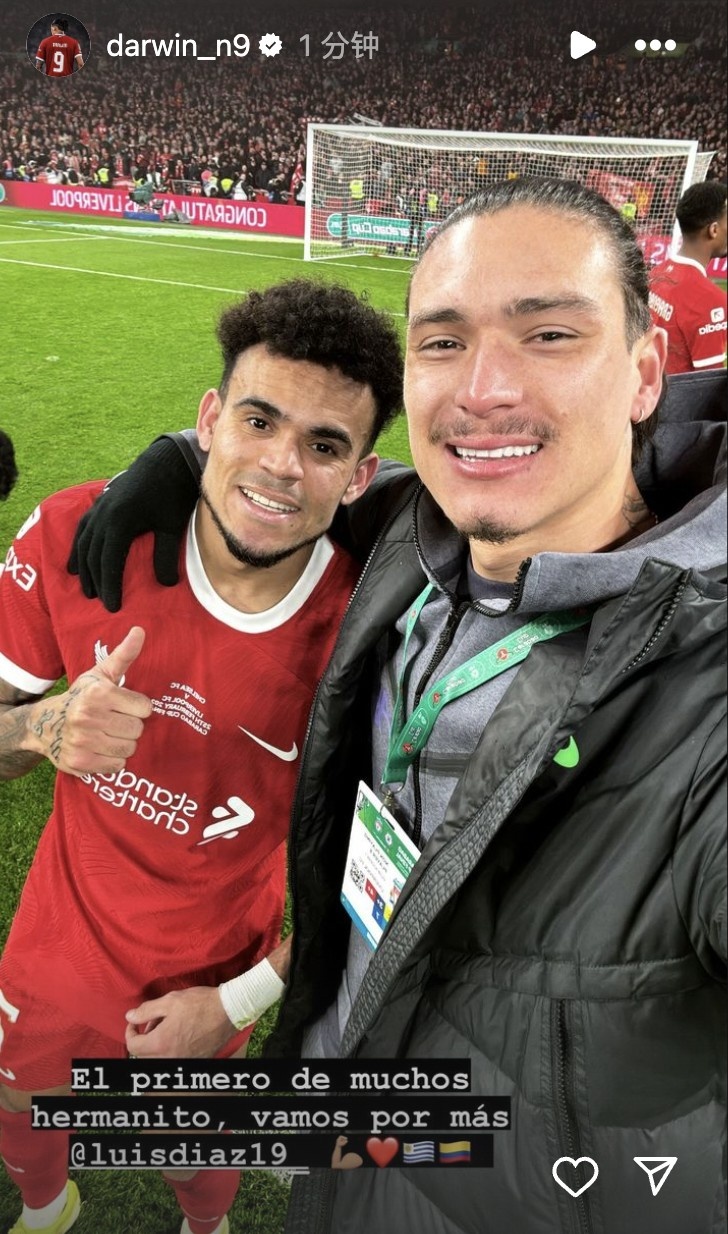 2月26日讯 利物浦击败切尔西拿下联赛杯,赛后努涅斯更新社交媒体庆祝球队夺冠。努涅斯晒出与迪亚斯合照:众多冠军中的第一个,让我们去赢得更多!(任意门)