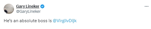英超名宿莱因克尔在社媒盛赞范迪克:“他是绝对的老大@范迪克”
