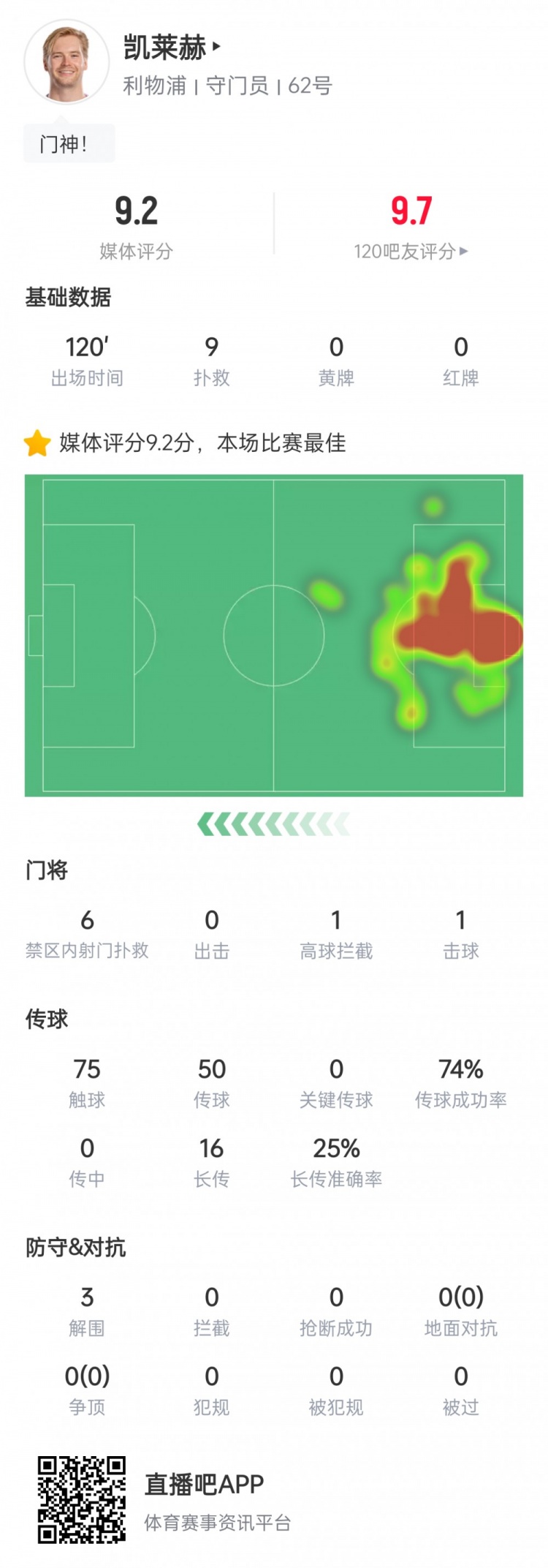 2月26日讯 23-24赛季英格兰联赛杯决赛,利物浦加时赛1-0力克切尔西,范迪克金头制胜。红军门将凯莱赫发挥出色,做出多次关键扑救,他也获得了全场最高的9.2分。