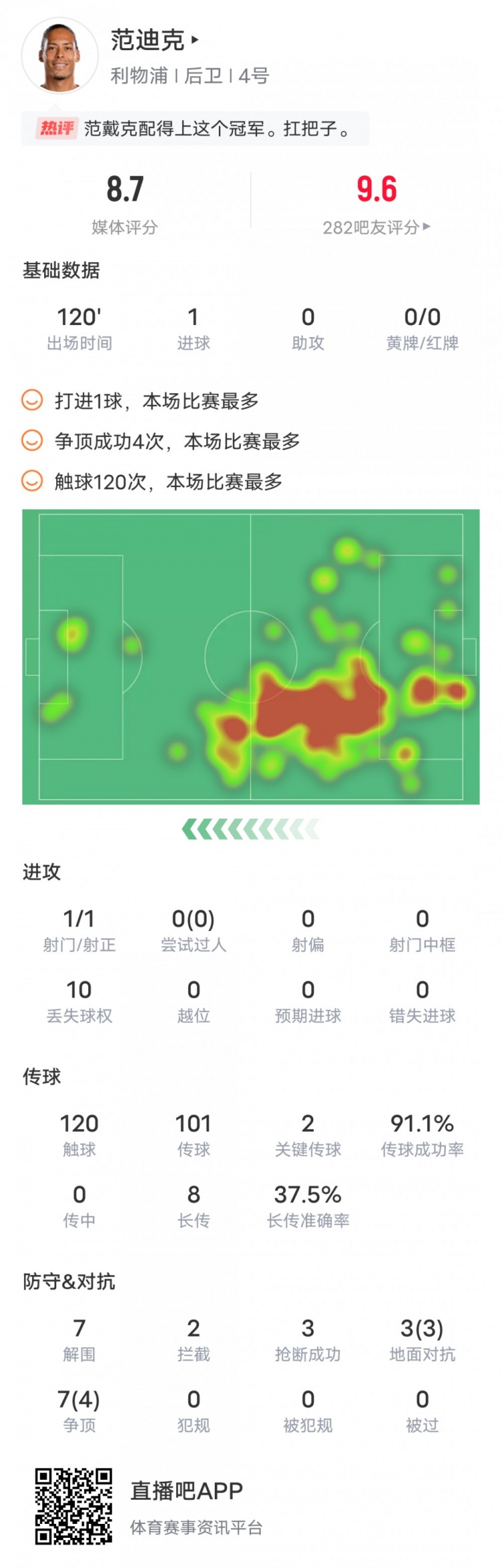 范迪克本场比赛数据如下: