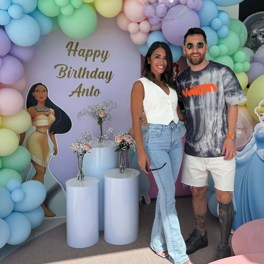 图中,三个儿子蒂亚戈、马特奥和CIRO分别穿着迈阿密国际、迈阿密热火和阿根廷球衣。