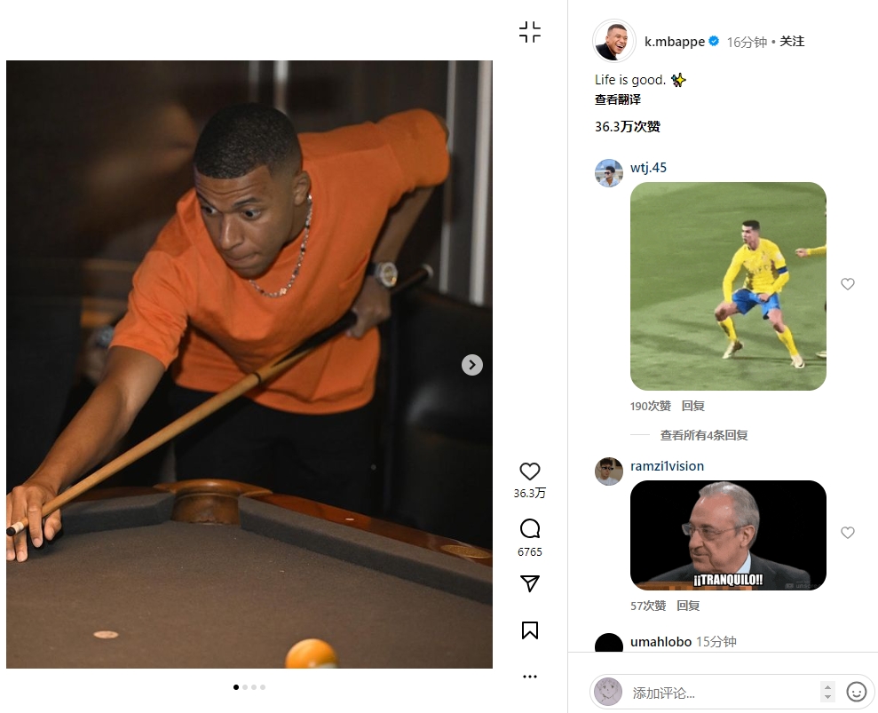 欣赏巴塞罗那夜景+打台球姆巴佩晒近况:生活真美好✨
