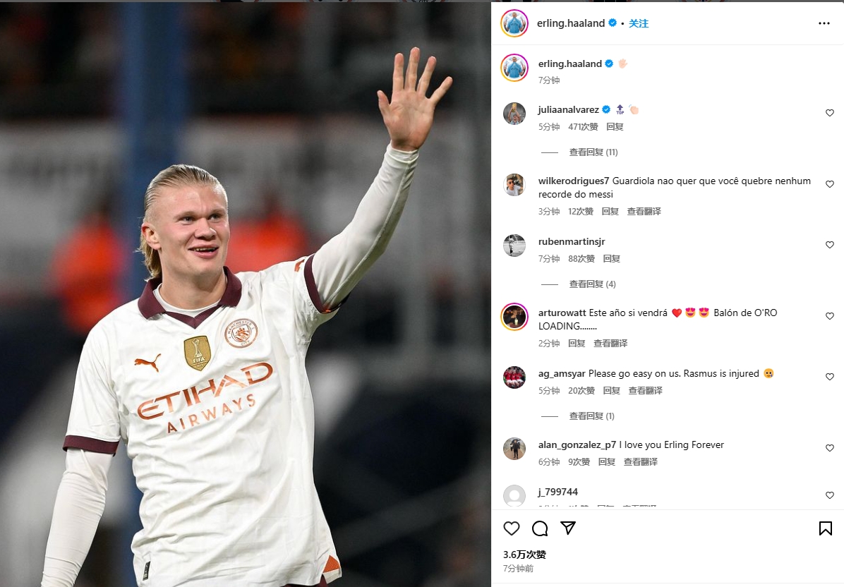 哈兰德赛后更新ins,晒出比赛照: