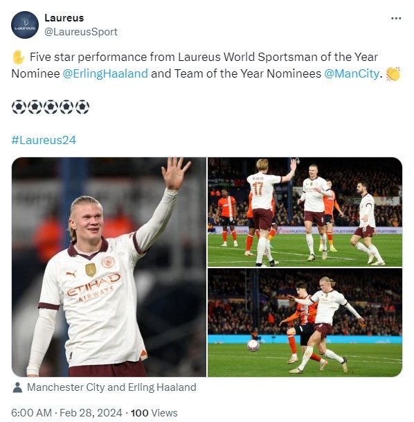 赛后劳伦斯奖官方盛赞了本场比赛哈兰德和曼城的表现:五星级的表演来自劳伦斯年度最佳男运动员提名者埃尔林-哈兰德和年度最佳球队提名者曼城。