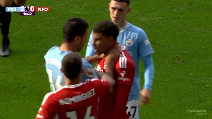 此前曼城对阵水晶宫的比赛中,曼城中场罗德里也曾因锁喉动作染红↓