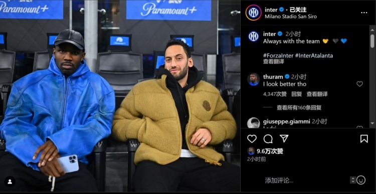 2月29日讯 在今天结束的意甲第21轮补赛中,国米主场4-0大胜亚特兰大。本场比赛,受伤的小图拉姆和恰尔汗奥卢来到了现场为球队助威。国米官方账号也晒出两人在