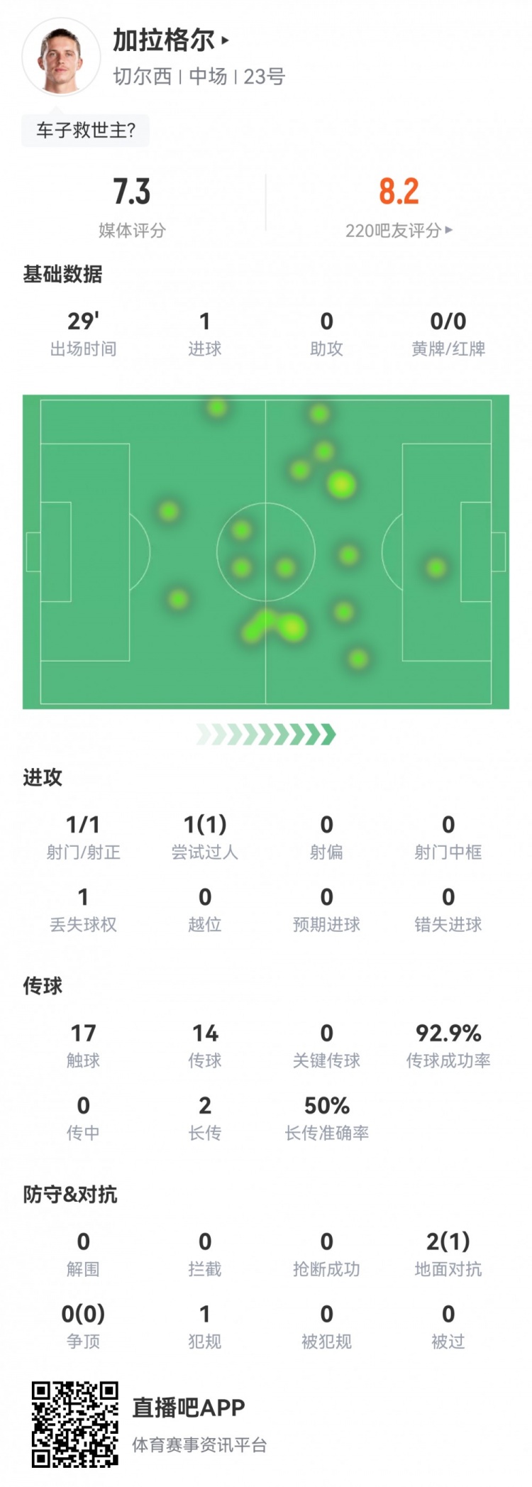 加拉格尔本场数据:替补登场29分钟,1射1正即打进绝杀球