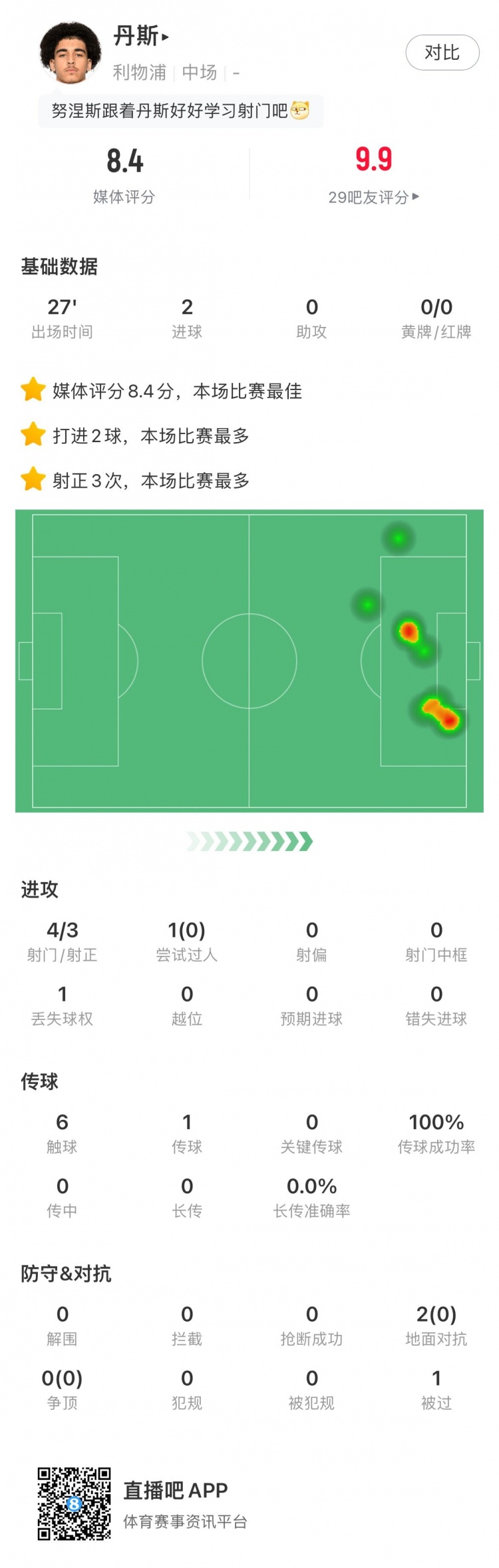 18岁小将丹斯本场数据:替补出战27分钟上演梅开二度,评分8.4分