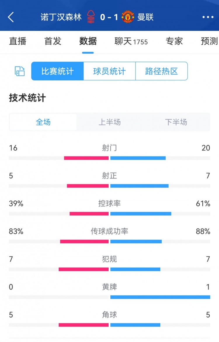 曼联1-0森林全场数据对比:射门20-16,射正7-5,犯规7-7