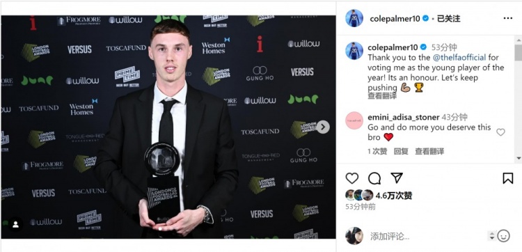 帕尔默晒出自己与奖杯的合照,并写道:“感谢主办方将我选为年度最佳年轻球员!这是我的荣幸,让我们继续努力。”