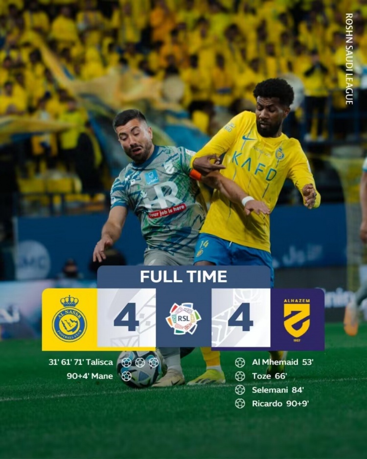 沙特联赛第22轮,利雅得胜利4-4遭垫底队哈森姆绝平,C罗本场停赛,塔利斯卡戴帽,马内破门。