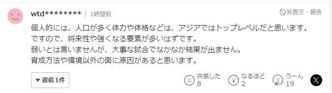 “我个人认为,中国人口众多,身体体格等在亚洲仍属于领先水平。因此,应该有崛起的潜力和可能。虽然不能说弱,但中国队在重要的比赛中总是没有取得好的结果。我认为是培养方法和环境以外的方面的原因。”