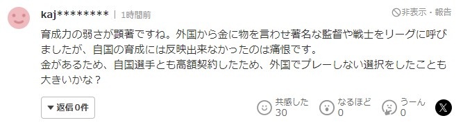“本土球员培养能力的薄弱是很明显的。虽然从外国花钱请了著名的教练和球星到中超联赛,但是不能反映在本土球员的培养上是很痛心的。因为高薪,所以不去外国踢球也是很好的选择吧?”
