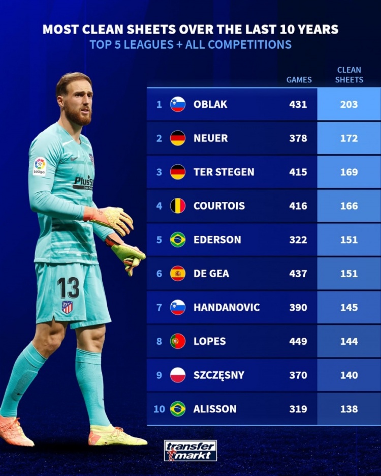 五大联赛门将近10年零封榜:奥布拉克居首,诺伊尔、特狮前三