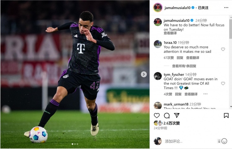 穆西亚拉社媒:我们必须做得更好,现在要专注于下周二的比赛