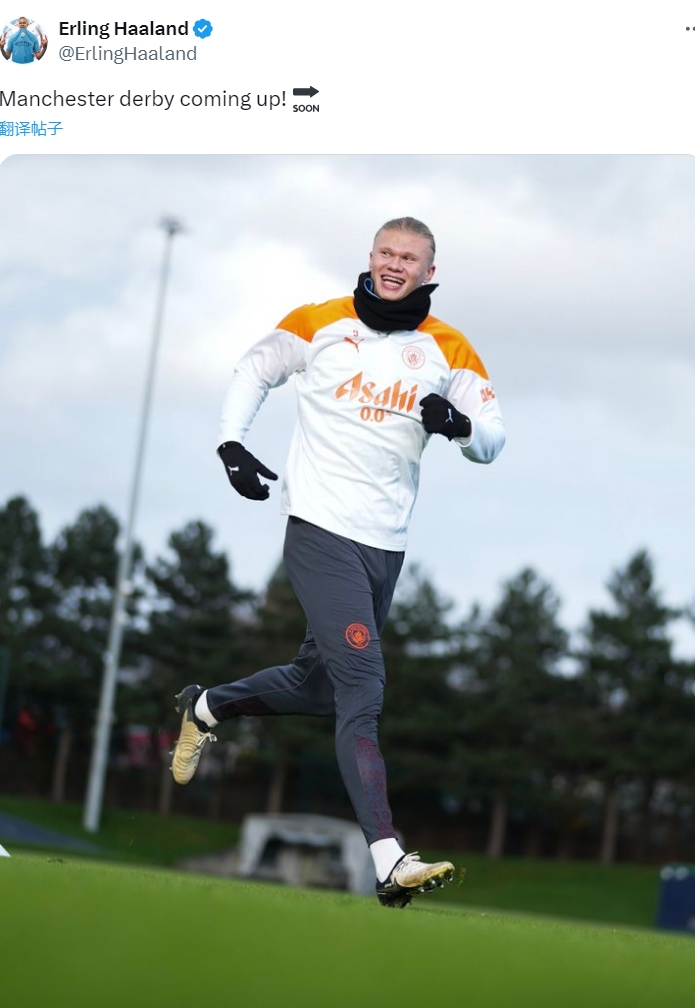 赛前,曼城前锋哈兰德在社交媒体晒图,为本场比赛预热。哈兰德晒出自己的训练图,并配文写道:“曼彻斯特德比要来了!”