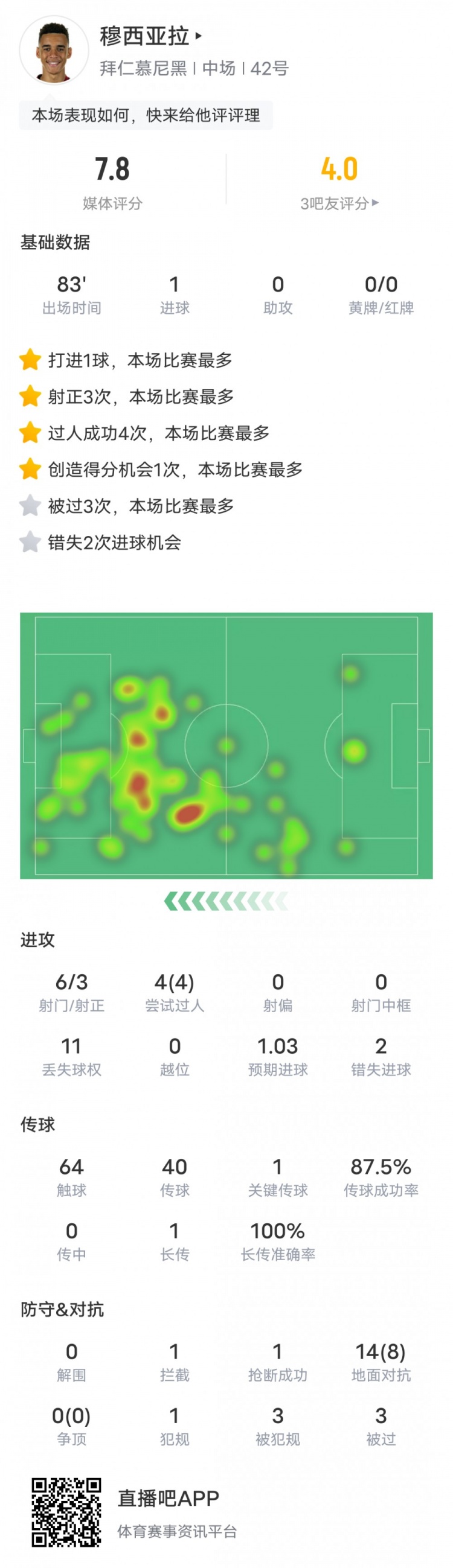 穆西亚拉本场比赛数据:1进球1关键传球4过人成功,评分7.8
