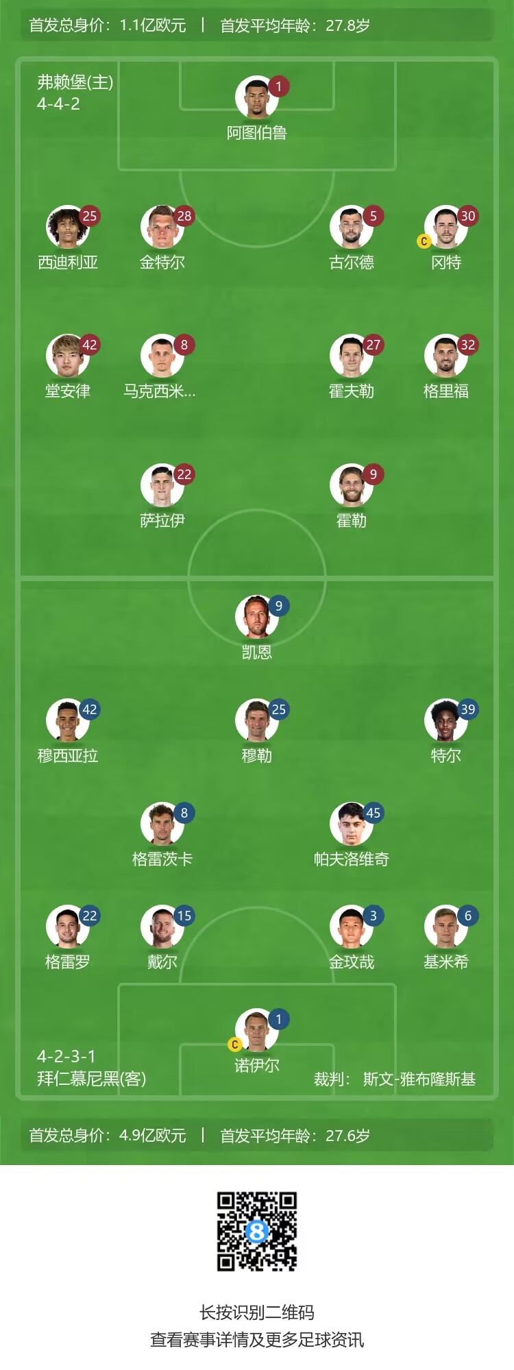 拜仁vs弗赖堡首发:凯恩领衔,穆勒、戴尔先发,于帕替补