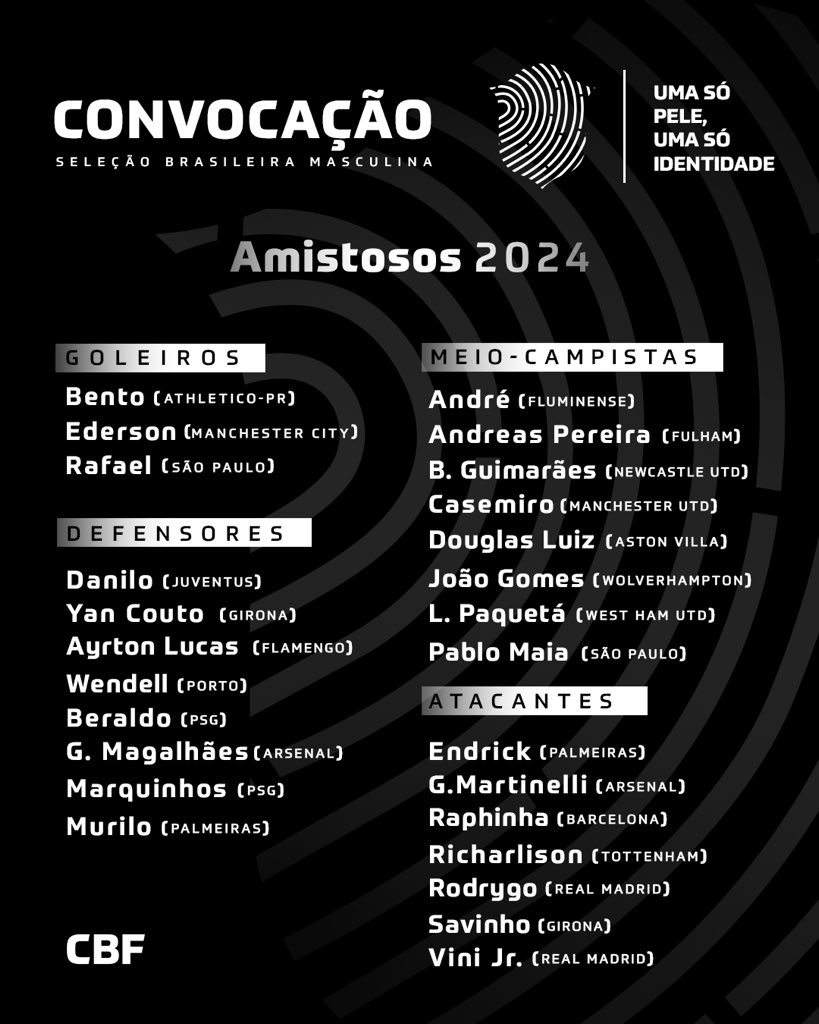 3月2日讯 巴西国家队公布了最新一期的大名单,其中,17岁的恩德里克入选,此外,阿利森、蒂亚戈-席尔瓦、内马尔伤缺,理查利森、卡塞米罗、马丁内利、加布里埃尔、埃德森等人入选。