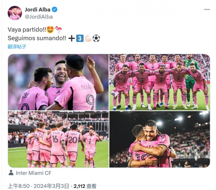 3月3日讯 在北京时间今天上午结束的美职联比赛中,阿尔巴首发踢满全场,帮助迈阿密国际主场5-0击败奥兰多城。阿尔巴在社交媒体上晒出赛场照片,并写道:“多么棒
