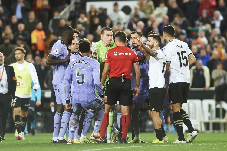 3月3日讯 西甲第27轮,皇马2-2瓦伦西亚,贝林厄姆进球前裁判响哨绝杀无效。据塞尔电台报道,比赛结束后在球员通道再次发生冲突,塞巴略斯、吕迪格、维尼修斯参与