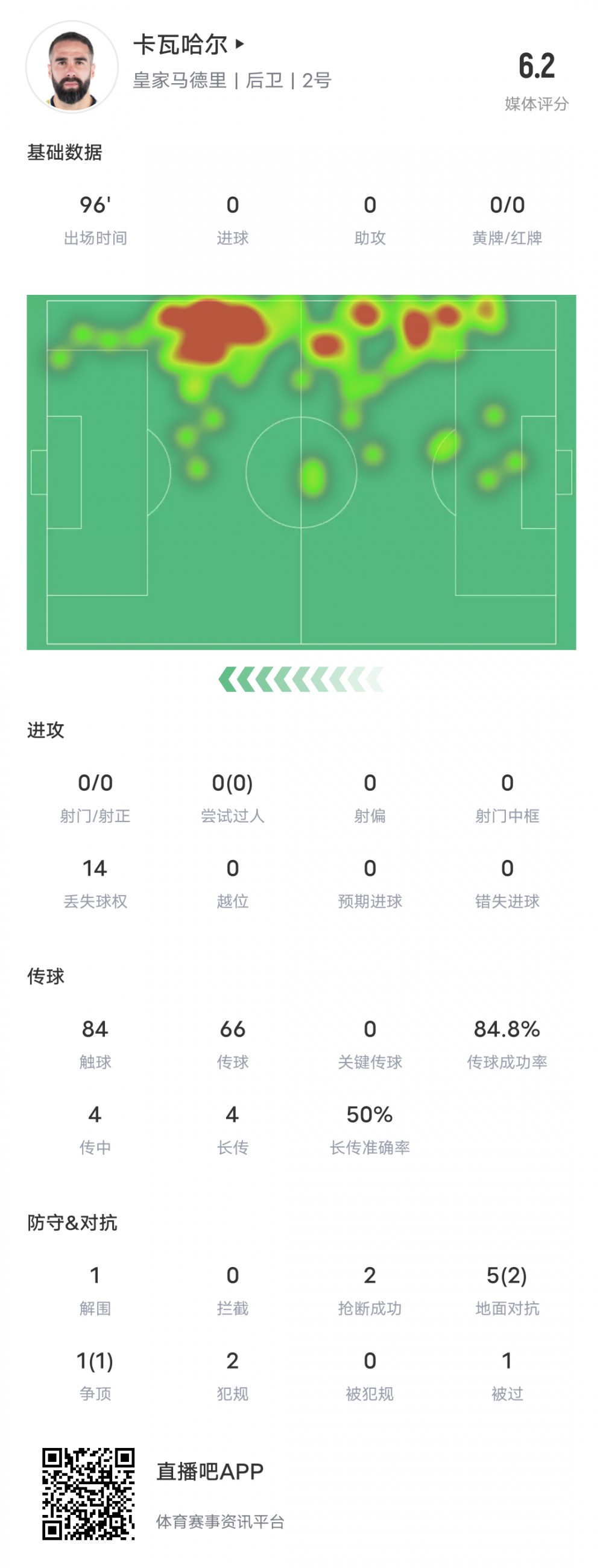 卡瓦哈尔本场数据:1解围2抢断,14次丢球权1失误致失球,评分6.2